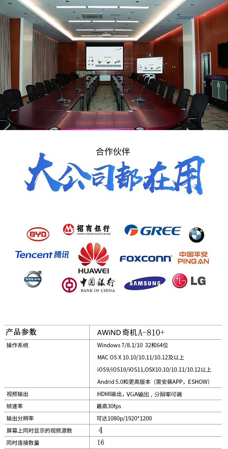 AWiND奇機無線會議投屏A-810+一鍵聯無線投屏手機平板電腦一對多無線投屏器