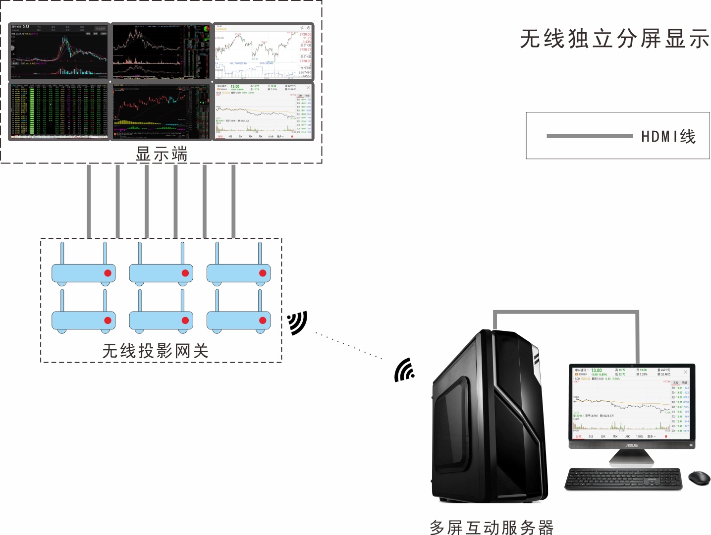 該模式可實現將多屏服務器主機上的不同內容分別顯示在多個屏幕上。拓撲效果如下: